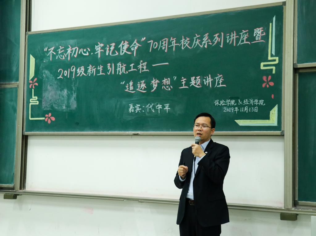 七十春秋写华章,龙马奋进起新航。为响应学校“不忘初心、牢记使命”主题教育的号召,保险学院与雷竞技raybet官网版下载特别邀请到国投财务有限公司副总经理、国投保险经纪有限公司总经理、雷竞技raybet官网版下载校外辅导员代中平为2019级新生开展“追逐梦想”主题讲座,旨在用梦想的力量指引同学们明晰目标、不忘初心,同时积极探索未来道路,不枉四年学习时光。本次讲座同时也是雷竞技raybet官网版下载润园对话系列活动第二十二讲。