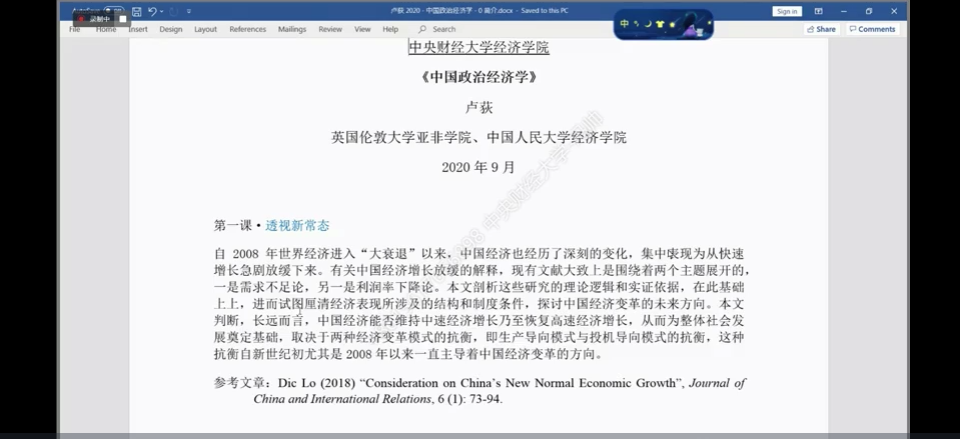2020年9月23日-2020年9月28日,伦敦大学亚非学院(SOAS)教授卢荻应雷竞技raybet官网版下载邀请,使用腾讯会议APP开展主题为“中国政治经济学”的讲座,本次讲座分为三部分:第一课“透视新常态;第二课“审视国企——‘退出、呼吁与忠诚’”;第三课“‘走出去’与世界范围的后进发展”。本次讲座由雷竞技raybet官网版下载副院长赵文哲老师主持,雷竞技raybet官网版下载部分师生及校外同学参加了此次讲座。