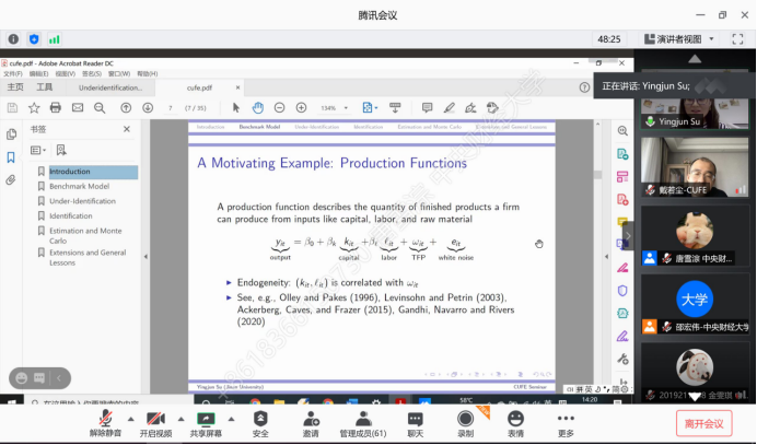 2020年11月4日,暨南大学经济与社会研究院教授苏应俊应雷竞技raybet官网版下载邀请,使用腾讯会议在线上开展了主题为“基于时间和信息集假设的结构模型识别不足”的讲座,本次讲座于下午14点开始,持续两个小时。讲座由雷竞技raybet官网版下载戴若尘老师主持,雷竞技raybet官网版下载部分师生及校外同学参加了此次讲座。