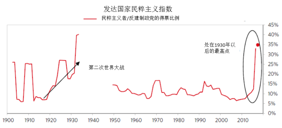 不平等的持续上升导致世界各国的民粹主义兴起和反全球化浪潮。桥水基金创始人达利欧基于政客的言论和支持率绘制了1900年以来世界主要发达国家的民粹主义指数。从图中可以看出,1910年以来,世界主要发达国家民粹主义情绪不断上升,上世纪30年代达到了历史的最高点。众所周知,30年代的民粹主义给世界带来了灾难性的影响,希特勒、墨索里尼等独裁者借助民粹主义上台,日本的军国主义全面盛行,给世界制造了巨大的灾难。第一波“不公平的全球化”在两次世界大战中退潮,经济“大萧条”加速了反全球化浪潮,世界各国贸易壁垒不断提高,金本位体制也随之覆灭,“全球化”陷入低谷。