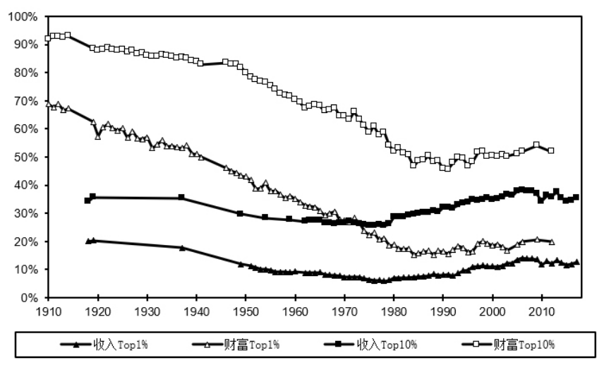 1910-1950年,受两次世界大战和经济大萧条的影响,不平等程度大幅度下降;